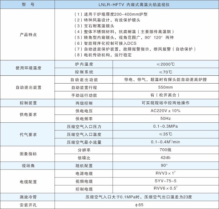 LNLR-HFTV型火焰監(jiān)視儀是運用于電廠、電站、化工、鋼鐵等行業(yè)的,煤粉爐、燃氣爐、裂解爐、垃圾焚燒爐等高溫工業(yè)鍋爐的監(jiān)視裝置,專門監(jiān)視鍋爐爐內的點火狀態(tài),燃燒情況,滅火保護的監(jiān)視裝置。內窺火焰監(jiān)視裝置是根據(jù)不同鍋爐選擇合適的安裝位置,將耐高溫潛望管及鏡頭,通過電動退膛機構把高溫潛望管及耐高溫寶石鏡頭伸進爐膛內,通過光電信號轉換至控制室內的顯示器上,運行操作人員可以通過顯示屏,清楚的看到鍋爐火焰燃燒的真實圖像。(從點火到運行的燃燒狀態(tài)以及鍋爐的不正常滅火),燃氣爐能通過火焰監(jiān)視儀清楚的看到爐內的水冷壁、爐墻、爐底等真實燃燒情況。從而能夠及時的發(fā)現(xiàn)并處理,因各種原因發(fā)生的燃燒缺陷或者不正常停爐,避免事故的發(fā)生,給運行操作人員安裝一套“火眼金睛”是鍋爐安全生產不可缺少的產品,給客戶帶來安全經(jīng)濟效益。